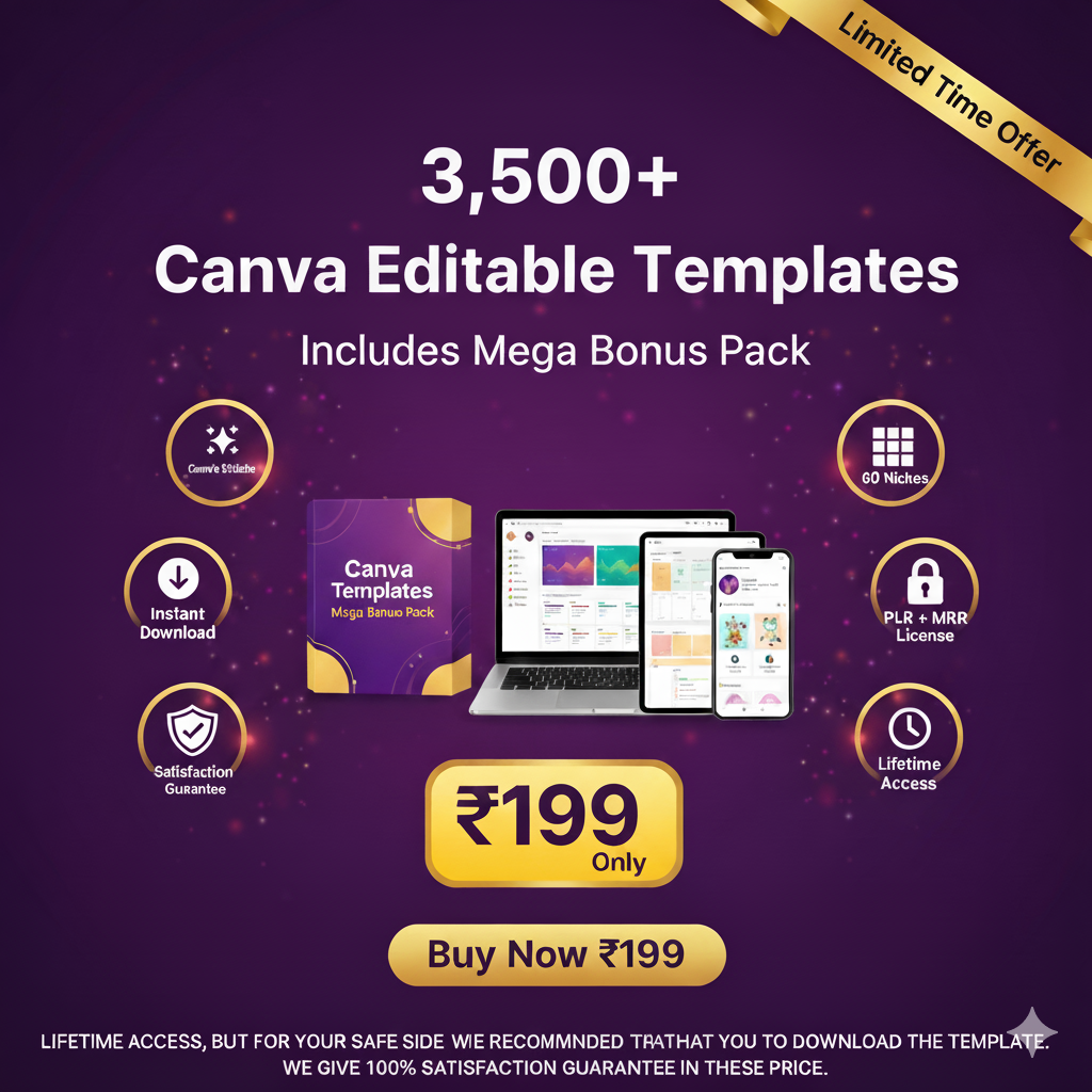 You’ll get 3,500+ professionally designed Canva templates across 60+ niches, including business, marketing, coaching, fitness, lifestyle, education, and more — all 100% editable and ready to use instantly.